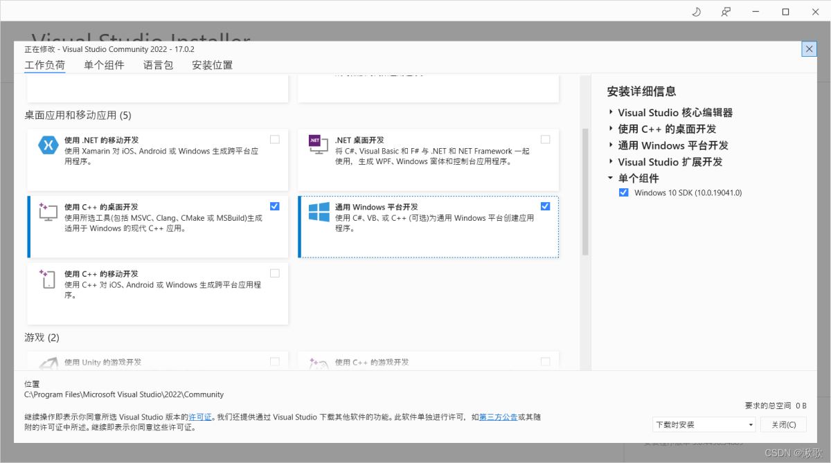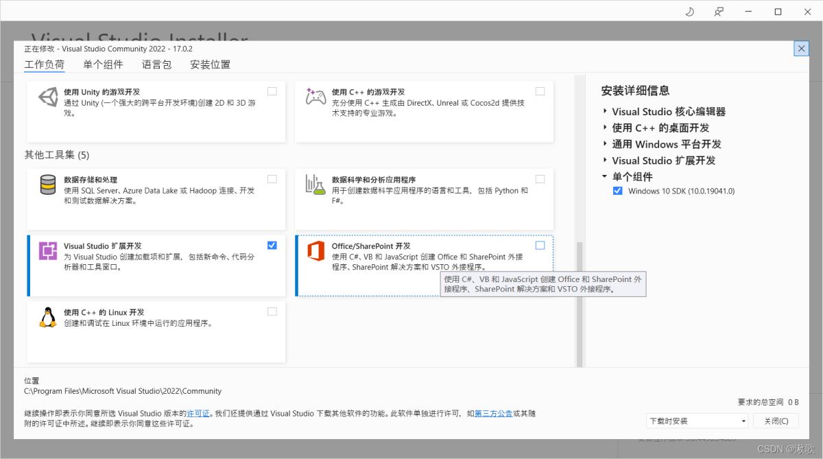 (安装的【工作负载】步骤时选的是【使用C++的桌面开发】和【通用Windows平台开发】和其它工具集中的【VisulStudio扩展开发】)