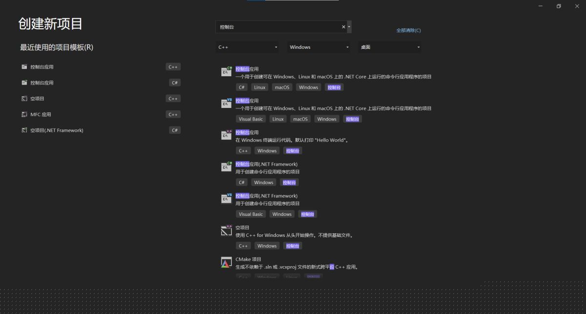 1、打开visual studio 2022创建新项目,选择C++控制台应用
