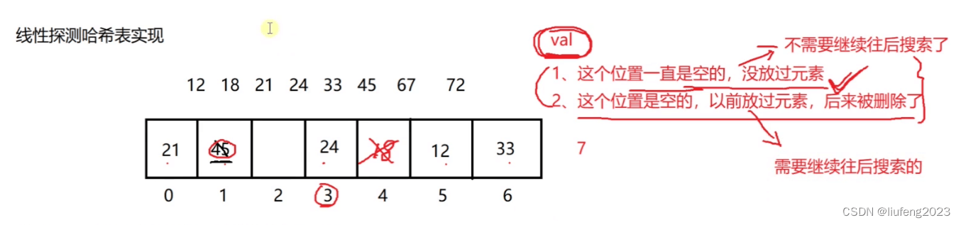 - 访问4下标的时候发现这个位置是空的(空的有两种情况),如果这个位置一直是空的,则就不用继续向后找了,val不存在!因为是线性探测法,所以当时val如果要放的时候肯定是要放在这里的。