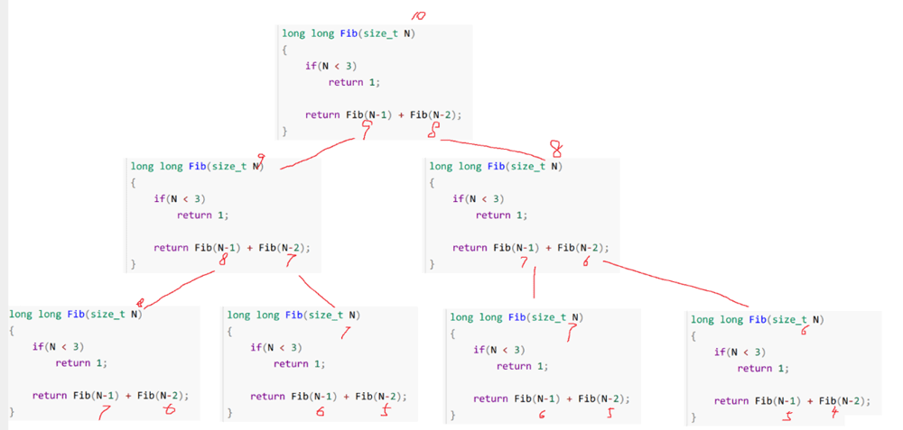 通过计算分析发现基本操作递归了2^N次,时间复杂度为O(2^N)。