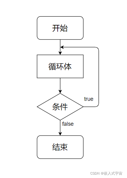 从上面图示 do…while() 语句流程中可以看出,do…while() 语句会先进入循环体执行里面的内容,然后再进行条件判断,当条件为真,就继续执行循环体的内容,当条件为假就退出do…while() 语句。也就是说 do…while() 语句 最少会执行一遍循环体里面的内容。