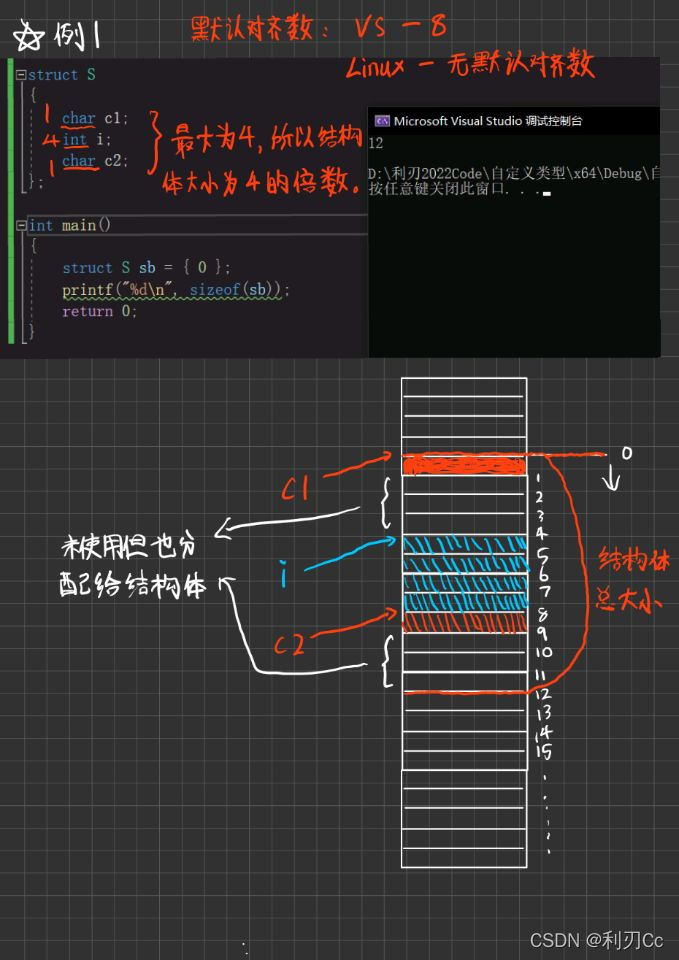 3.结构体总大小为最大对齐数(每个成员变量都有一个对齐数 )的整数倍。