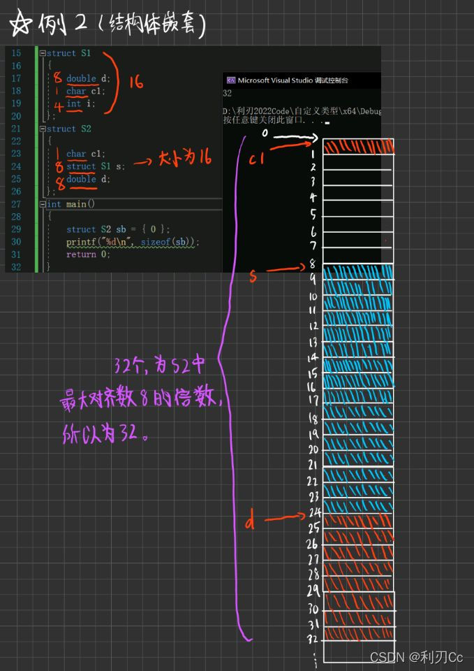 4.如果嵌套了结构体的情况,嵌套的结构体对齐到自己的最大对齐数的整数倍处,结构体的整体大小就是所有最大对齐数(含嵌套结构体的对齐数)的整数倍。