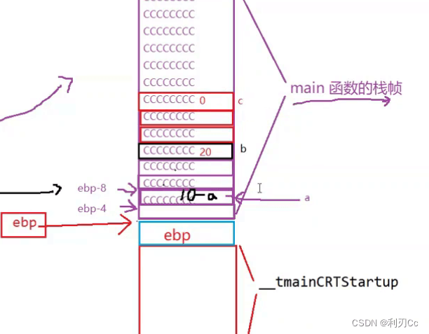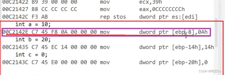 将10放到了ebp-8的位置,也就是ebp向上八个字节的位置,然后将20放到ebp-20的 位置,将0放到ebp-32的位置,如图: