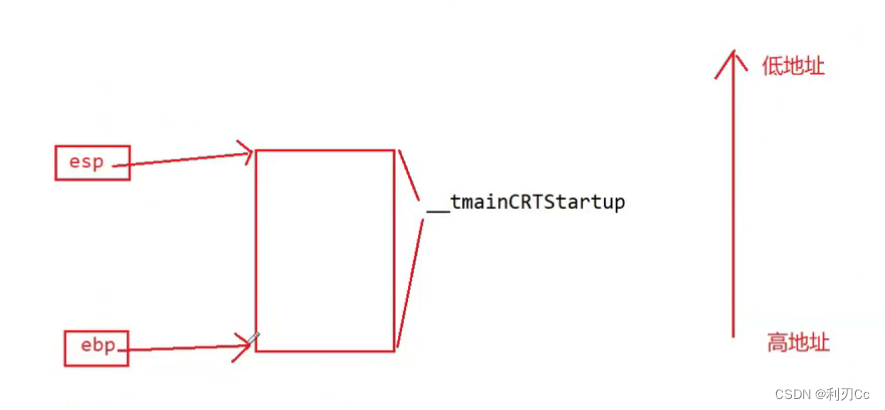 通过我们之前的了解,在开辟main之前先开辟了__tmainCRTStartup,所以我们来为其分配空间: