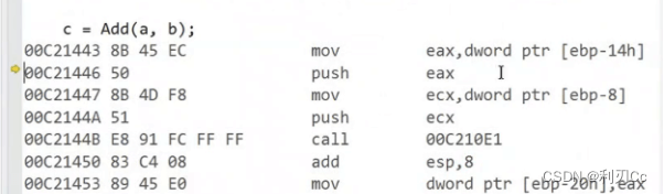 这里把ebp-20也就是b的值放到了eax中,然后压栈。接着把ebp-8也就是a 的值放到了ecx中,然后压栈。