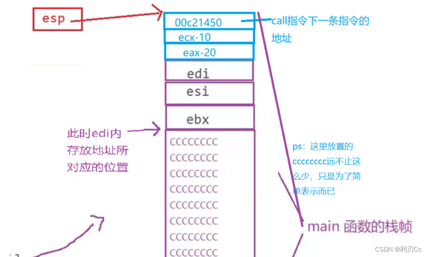 其中 ebp 和 esp 是用来维护函数栈帧的,他们里面存放的是地址。
