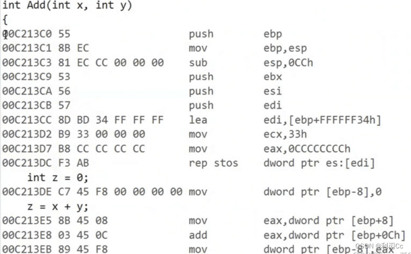 接下来就是将0赋给ebp-8的位置,然后把ebp+8也就是刚才传参过来的x,放到eax里,然后把ebp+12就是形参y与eax相加,最后把eax放到ebp-8也就是z的位置: