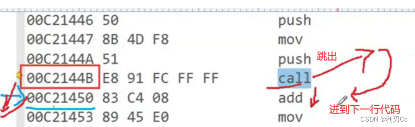 然后就是call就跳到了add这个函数的地址处去,注意,该处call后进行一个压栈操作,将add后面一步的地址放在该栈位: