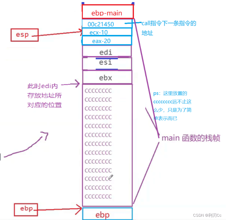接下来的四步:lea这步操作就是让[ebp-0E4h]这个值放入edi内,然后通过观察我们可以发现,此时放入新值后的edi所指向的就是对应在进行push三个寄存器ebx、esi、edi操作前的esp的位置,然后将39h赋给ecx,0CCCCCCCCh赋给eax,然后第四步就是将edi地址向下的39h个dword中全部放入0CCCCCCCCh。