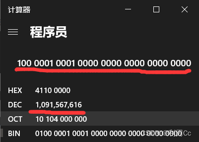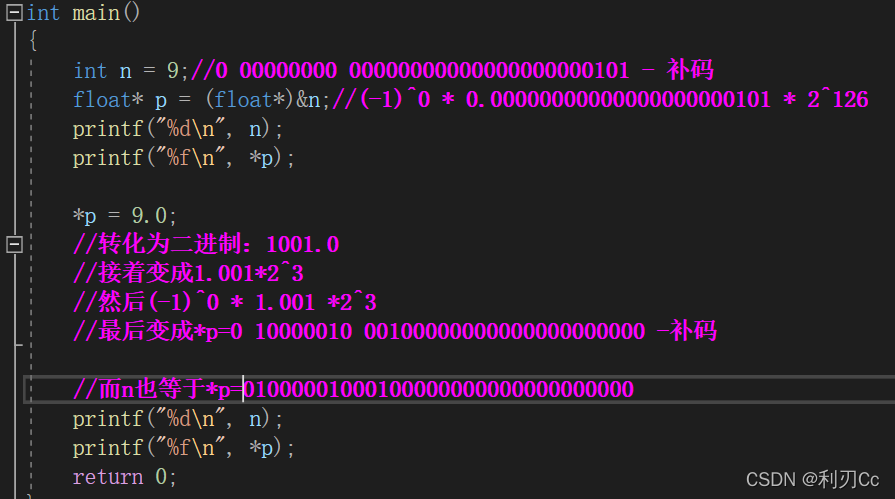 3.将*p改成9.0后按照上面的方法,先改成二进制 1001.1,然后写成 (-1)^0 * 1.001 * 2^3,最后按照格式变成补码,存到内存中去,此时补码为01000001000100000000000000000000,而n为整型数据,所以先取出这个补码,又因为其为正数,所以直接将补码转为十进制%d输出: