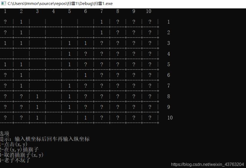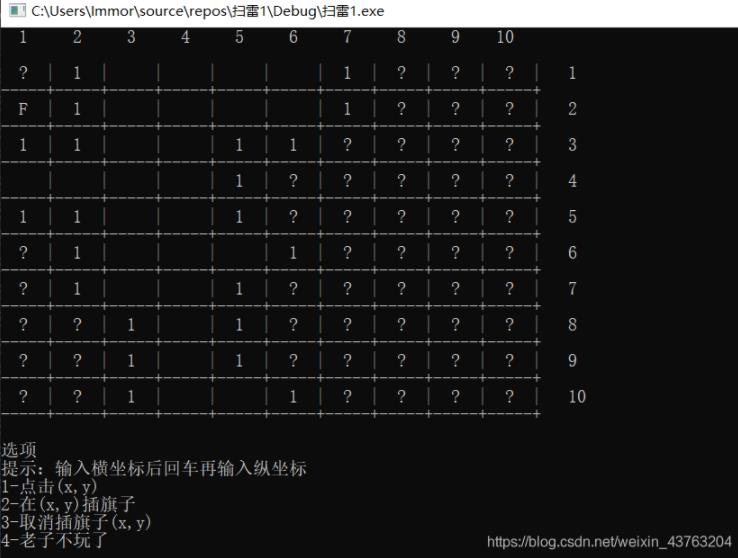 (1).输入坐标打开一个格子,此格子若是雷则游戏结束,若不是则显示周围雷的个数。