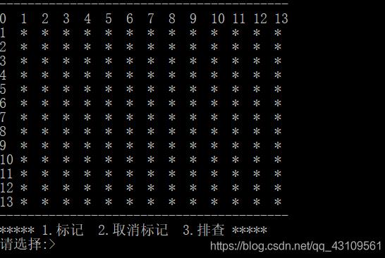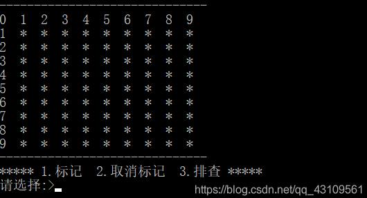 1.用二维字符数组mine[ROWS][COLS]来存储雷,现在我们用字符1来表示有雷,字符0表示无雷。用二维字符数组show[ROWS][COLS]将所有的元素初始化为*,并打印作为展现给玩家的。同时用show数组来表示对应的mine数组中周围雷即字符0的个数。