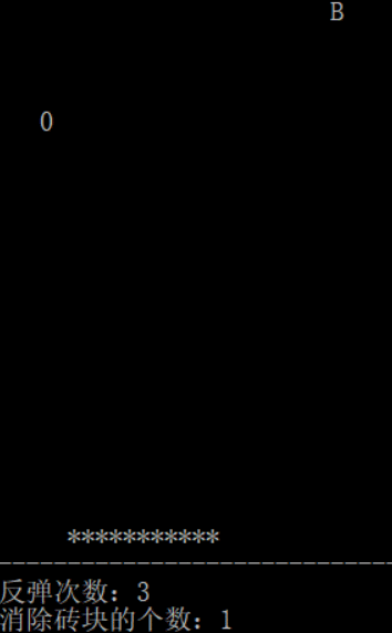 循环不断输出游戏的界面, 0 表示小球, B 表示砖块, * 表示挡板