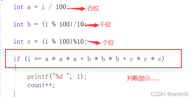 求出 i 这个三位数中的百位、千位、个位;然后立方相加 判断 是否等于 i 就可以了