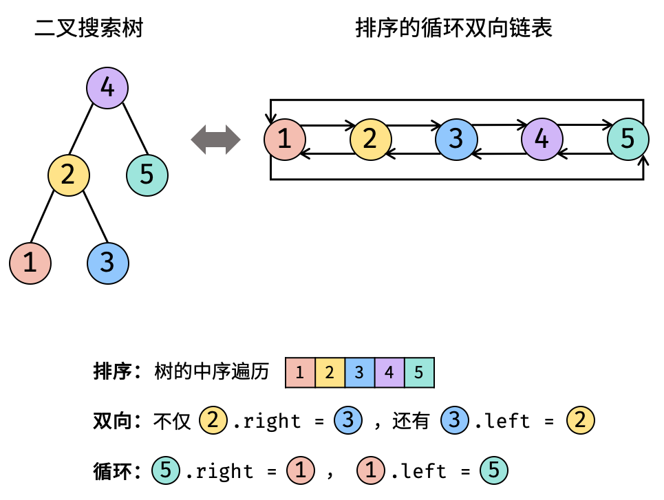 将 二叉搜索树 转换成一个 “排序的循环双向链表” ,其中包含三个要素: