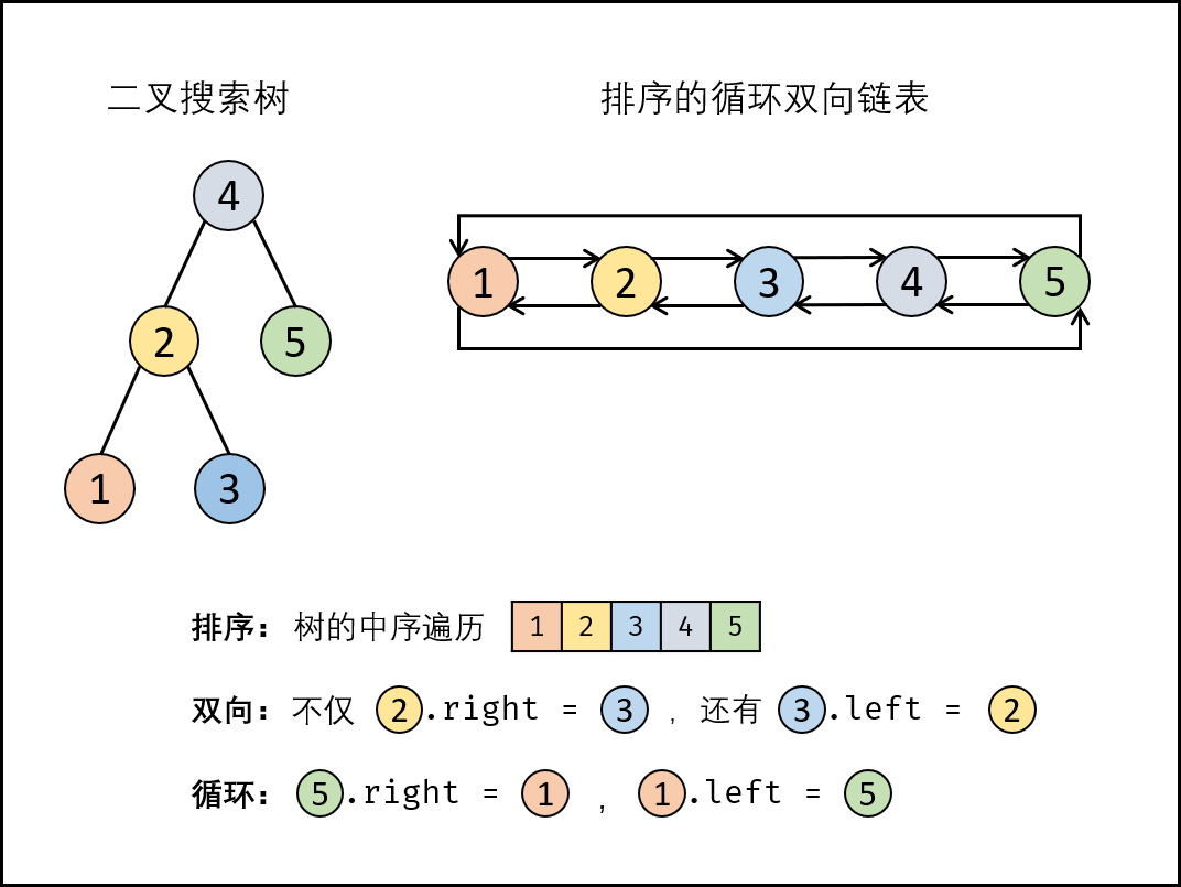 特别地,我们希望可以就地完成转换操作。当转化完成以后,树中节点的左指针需要指向前驱,树中节点的右指针需要指向后继。还需要返回链表中的第一个节点的指针。