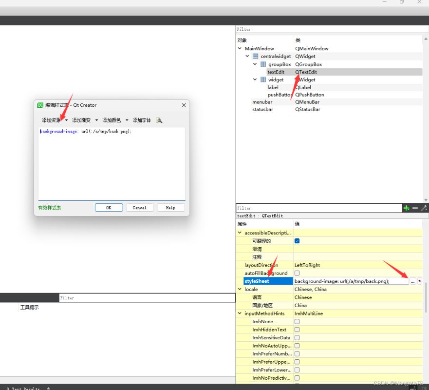 这里随便画画就好了,不过可以在文本显示框插入背景图,只需要在组件的styleSheet中添加资源即可