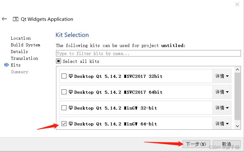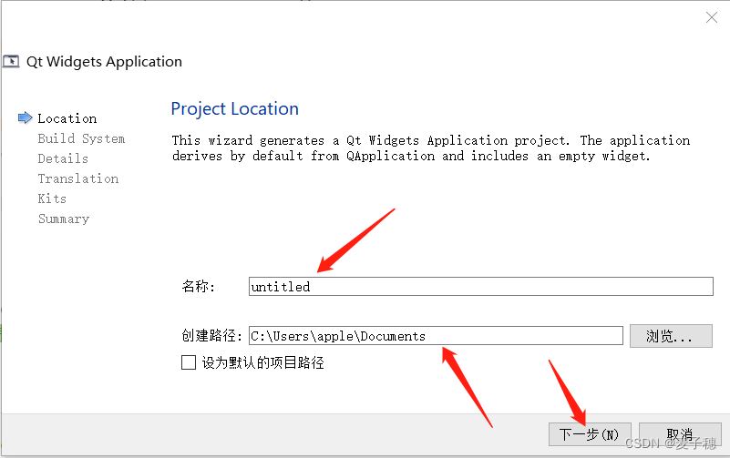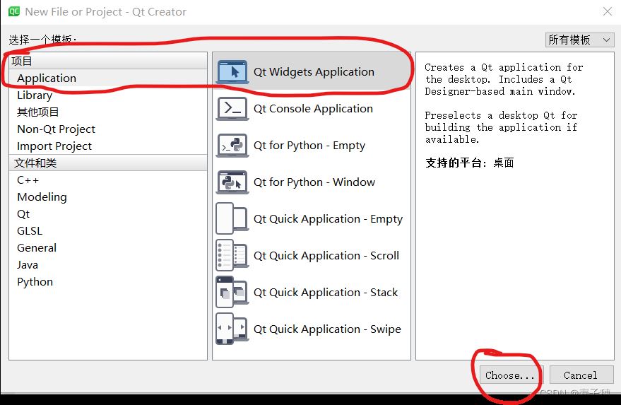 首先打开QT->新建文件或项目,然后跟着图中标注进行下一步