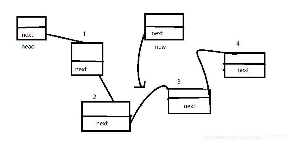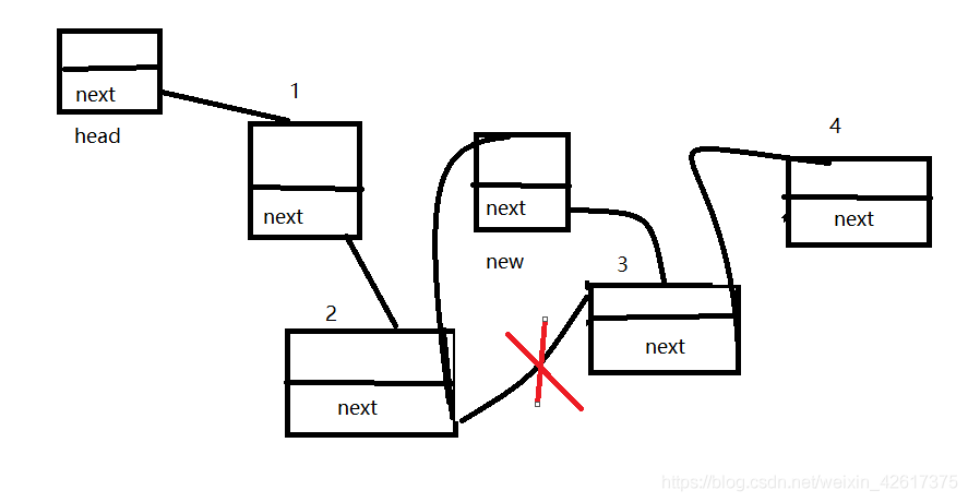 如图,我们把2节点的next指向了新插入的new节点,把new的next指向了3的节点,那2和3之间的连系就顺利成章的断掉了,那我们的插入就算完成了。