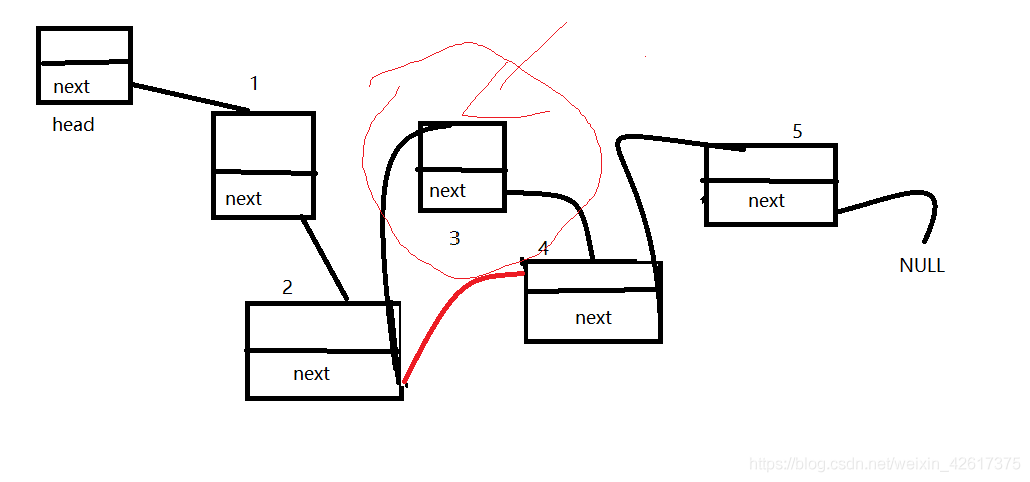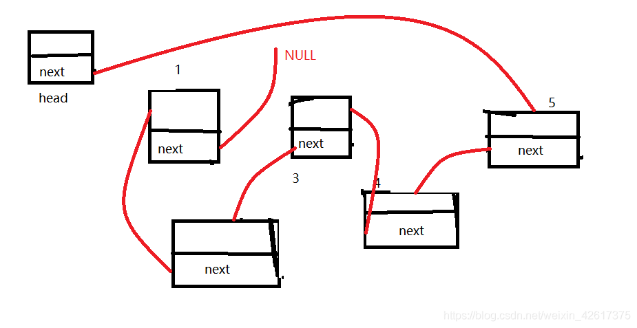 //即以前的首节点(即上图的节点1)的next应该指向null,首节点再变为prev,即上图的节点5