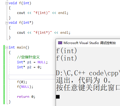 }按照我们正常的想法f(0)应该进入void f (int),f(NULL)进入void f(int*),因此我们想要得到的结果是分别打印f(int)和f(int*)。我们来看运行结果是否和我们所想的一样。