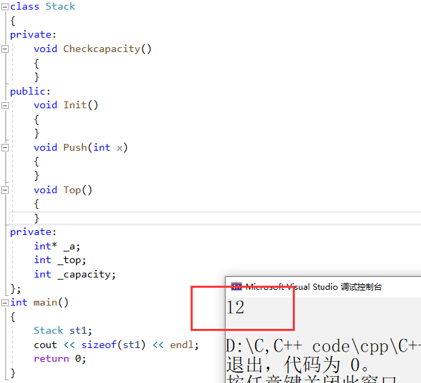 为了解决这一问题,在C++中,结构体不仅可以定义变量,还可以定义函数。我们如果把函数定义在类中,我们把成员变量封装在类中,外界函数无法调用。因此如果此时我们想调用栈顶元素,我们只能调用Top函数的接口。这就避免了上述问题的发生。