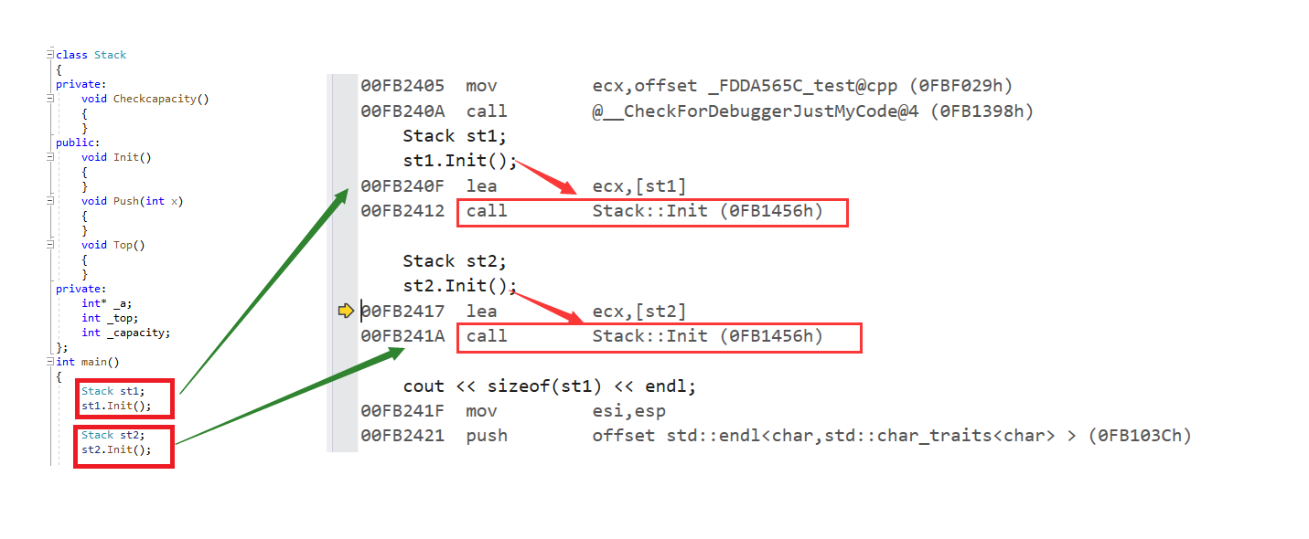 在上述中说到,类就像是一份建筑图纸,而所建造的每一个房子中的name,capacity,top应当是不一样的。但是所调用的方法Init(),Top()应当是同一个方法。因此没有必要把函数在对象中存一份。我们也可以通过汇编看看不同的对象是否调用同一个函数。