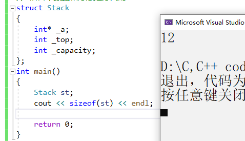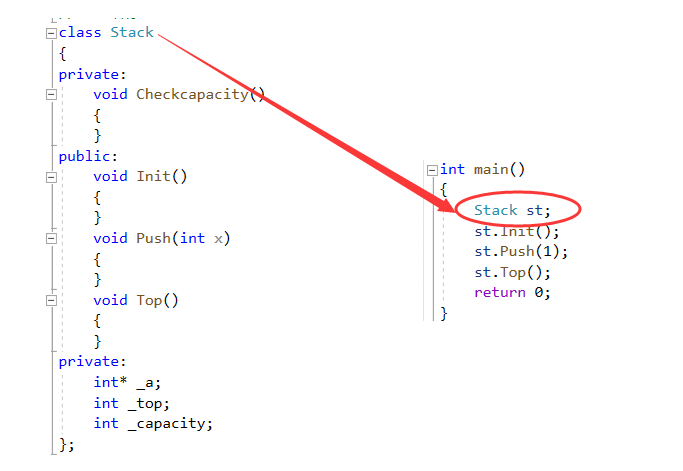 我们继续引用我们刚刚用C++所写的栈,其中st就是一个实例化对象。