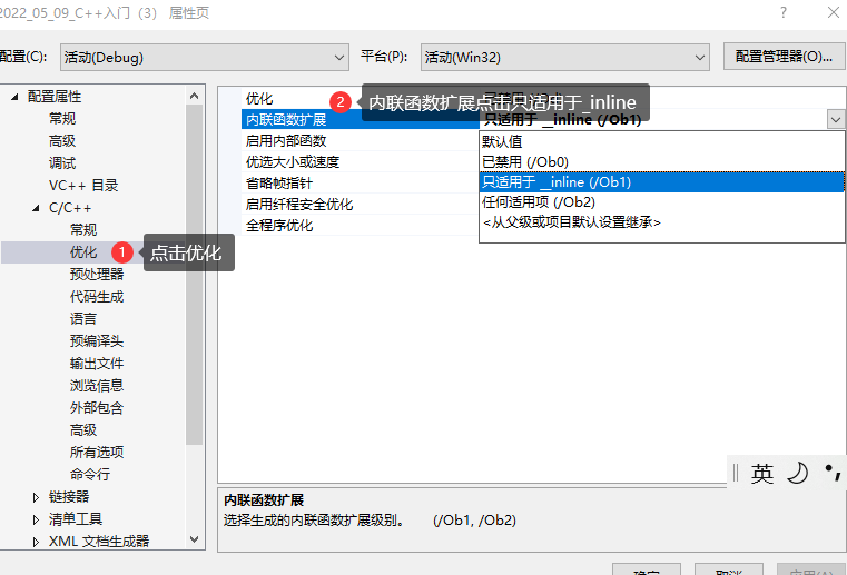 2. 在 debug 模式下,需要对编译器进行设置,否则不会展开 ( 因为 debug 模式下,编译器默认不会对代码进 行优化,以下给出 vs2019 的设置方式 )