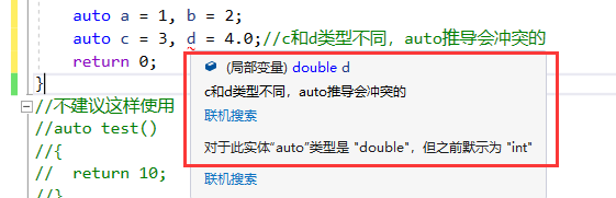 auto c = 3, d = 4.0;//c和d类型不同,auto推导会冲突的