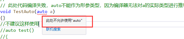 // 此处代码编译失败,auto不能作为形参类型,因为编译器无法对a的实际类型进行推导