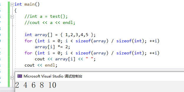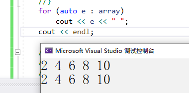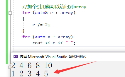 在这里我们使用到了一个新的for循环,范围for。它会依次自动取array中的数据,赋值给e,并且会自动判断结束,因此我们使用auto可以自动识别数组元素的类型。