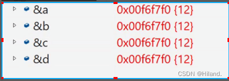 printf("%p %p %p %p\n", &a, &b, &c, &d);