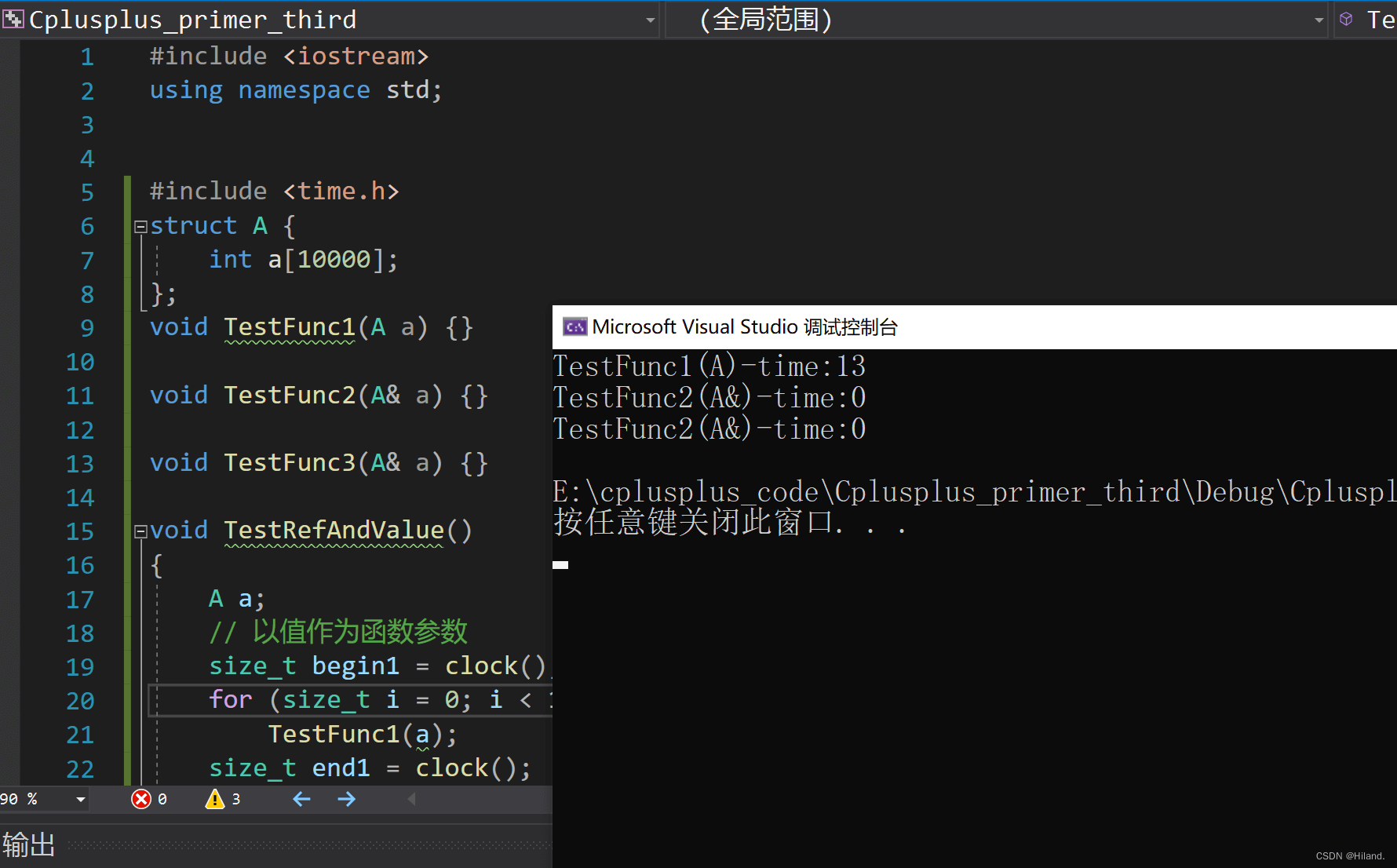 cout << "TestFunc2(A&)-time:" << end3 - begin3 << endl;