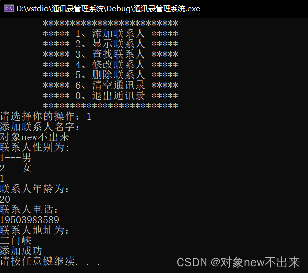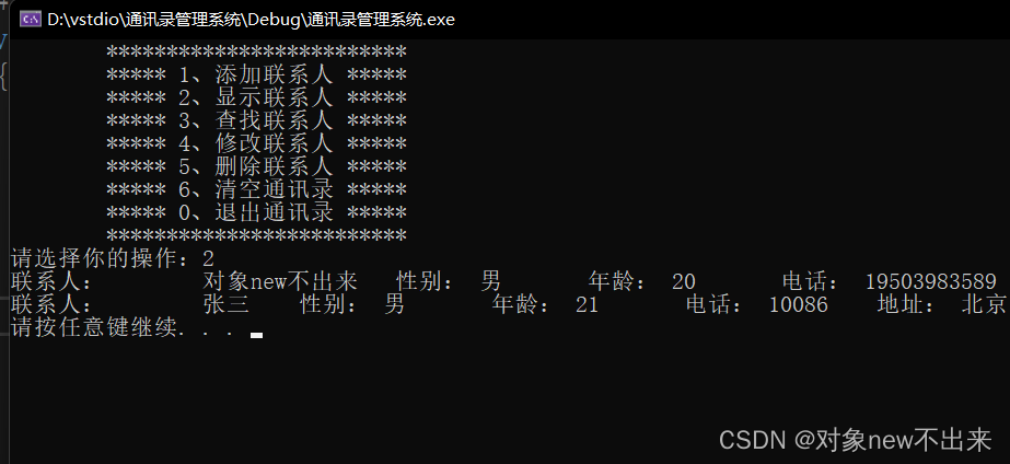 首先判断通讯录当前联系人数量,如果大于最大值停止添加联系人;然后作一个输入流来输入联系人信息,利用联系人数组填入联系人信息;姓名属性我们简单做了一个范围选择,只允许输入1和0并给出提示1代表男性;倒数第二行 abc->m_size++,更新联系人数量;最后有两个系统函数 system("pause") 和 system("cls"),分别时“按任意键继续...”和清空屏幕函数,让我们的通讯录更加稳定和美观。