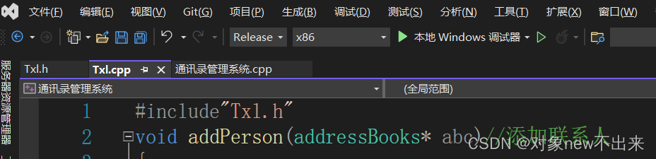 };结构体 addressBooks 中定义联系人数组最大为1000,同时初始化人联系人为0。还有一点值得注意,被嵌套的结构体person 需要在 addressBooks前创建,避免出现未定义的情况。