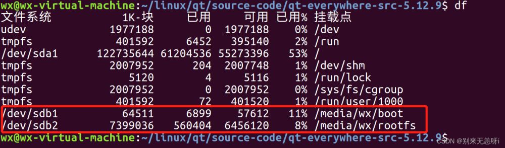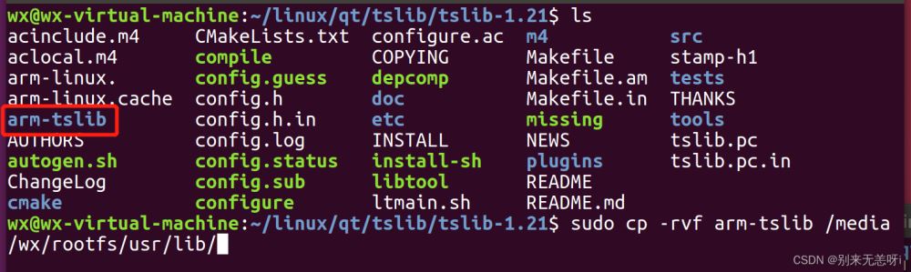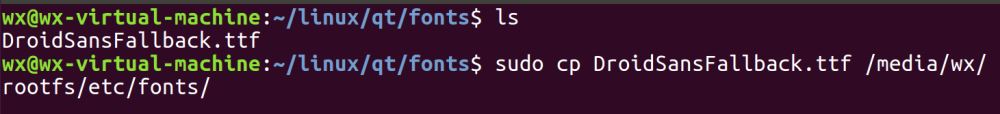 我这里SD卡的分区2(存放的根文件系统)已经挂载到ubuntu的/media/wx/rootfs/下面了,故这里直接拷贝即可,注意要加上sudo权限。