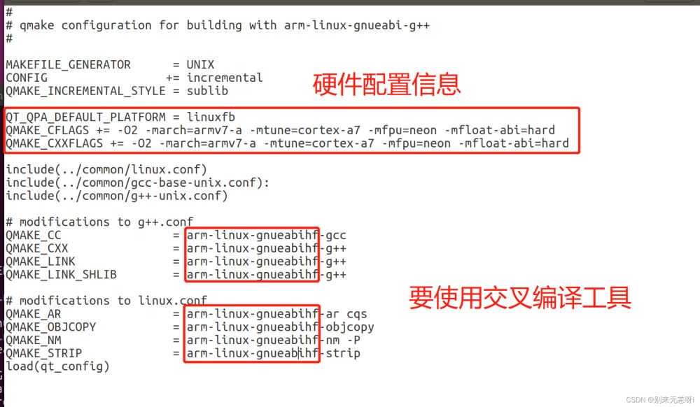 编辑 qtbase/mkspecs/qws/linux-arm-gnueabi-g++/qmake.conf文件
