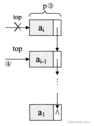 s->top=s->top->next;//使得栈顶结点指针下移一位,指向后一结点