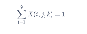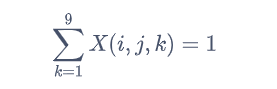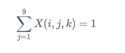 将9×9的数独矩阵转化为9×9×9的三维矩阵(张量),此时X(i,j,k)=1意味原矩阵第i行,第j列的元素为k,整个整数规划从现在开始变成了0-1规划,要想同一行的数值都不一样,只需要所有的行纤维的和都是1,想要同一列的数值都不一样,只需要所有列纤维的和都是1,非常奇妙的,我们又把问题转换为了一个线性求和的问题,very amazing啊!