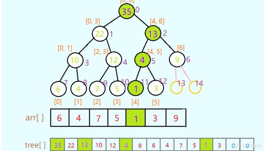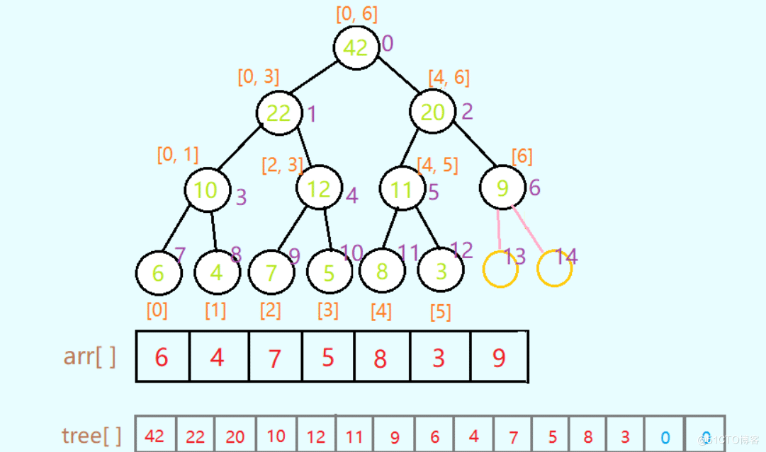 如下图所示,数组arr的长度为7,由于树是以2为基数的,且线段树中叶子结点保存的是arr中单个结点的值,我们可以将数组arr的长度设想为8 (2 ^ 3 = 8,理解为新添了一个元素0,这对区间和并不影响),此时它对应的线段树就是一棵结点数为15(1 + 2 + 4 + 8)的满二叉树。相应的结点值,映射到数组tree的值在图中可清晰的看出。