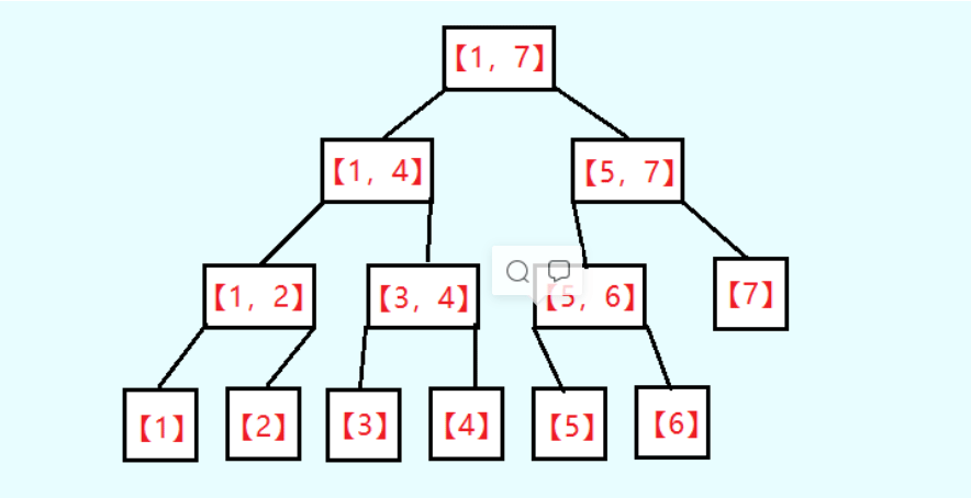 线段树中每一个结点代表一个区间,对于区间【1, 7】线段树的结构如下图