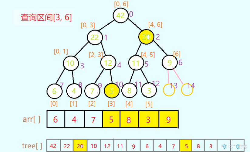 在线段树中,我们将它的和划分为两个区间[3]和[4,6],如图中的黄色结点