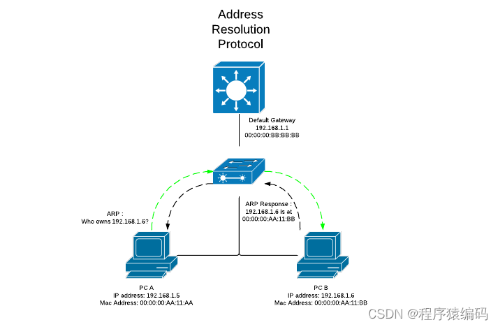 在这里,PC A 想要将流量发送到 IP 地址为 192.168.1.6 的 PC B。 然而,它不知道唯一的 MAC 地址,直到它通过 ARP 发现它,该 ARP 在整个第 2 层网段中广播。