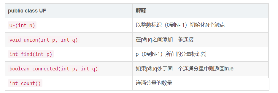 为了说明问题,我们设计了一份API来封装所需的基本操作:初始化、连接两个触点、判断包含某个触点的分量、判断两个触点是否存在于同一个分量之中以及返回所有分量的数量。详细的API如下表所示