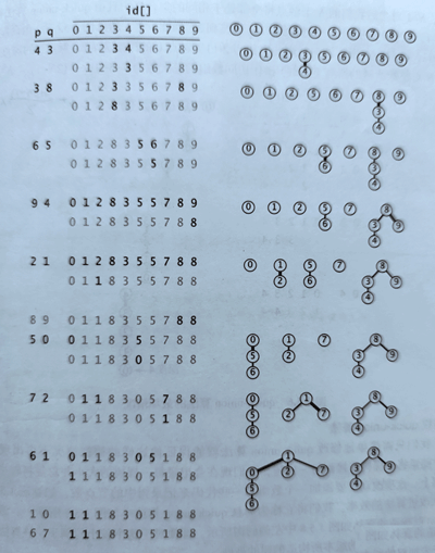 此方法保证当且仅当id[p] 等于 id[q]时p和q是连通的。换句话说,在同一个连通分量中的所有触点在id[]中的值必须全部相同。这意味着connected(p, q)只需要判断id[p] == id[q],当且仅当p和q在同一连通分量之中该语句才会返回true。为了调用union(p, q)确保这一点,我们首先要检查它们是否已经存于同一个连通分量之中。如果存在于同一分量中我们不需要采取任何行动,否则我们面对的情况就是p所在的连通分量中的所有触点的id[]值均为同一个值,而q所在的连通分量中的所有触点的id[]均为另一个值。要将两个分量合二为一,我们必须将两个集合中所有触点对应的id[]元素变为同一个值。为此,我们需要遍历整个数组,将所有和id[p]相等的元素的值变为id[q]的值。我们也可以将所有和id[q]相等的元素的值变为id[p]的值,两者均可。