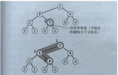 }在堆有序化的过程中我们会遇到两种情况。当某个结点的优先级上升(或是在堆底加入一个新的元素)时,我们需要由下至上恢复堆的顺序。当某个结点的优先级下降(例如,将根节点替换为一个较小的元素)时,我们需要由下至上恢复堆的顺序。首先来学习如何实现这两种辅助操作,然后再用它们实现插入元素和删除最大元素的操作。