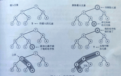在一个堆中,位置k的结点的父节点的位置为[k/2]向下取整,而它的两个子节点的位置则分别为2k和2k+1。用数组(堆)实现的完全二叉树的结构是很严格的,但它的灵活性已经足以让我们高效地实现优先队列。用它们我们能将实现对数级别的插入元素和删除最大元素的操作。利用数组中无需指针即可沿树上下移动的便利和以下性质,算法保证了对数复杂度的性能。