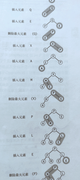 优先队列由一个基于堆的完全二叉树表示,存储于数组pq[1..N]中,pq[0]没有使用,pq[0]的值有时可以作为哨兵来用。在insert()中,我们将N加1并把新元素添加在数组最后,然后用swim()恢复堆的秩序。在delMax()中,我们从pq[1]中得到需要返回的元素,然后将pq[N]移动到pq[1],将N减1并用sink()来恢复堆的秩序。同时我们还将不再使用的pq[N+1]设为null,以便系统回收它所占用的空间。此处省略动态调整数组大小的代码,有兴趣的朋友可以自己写写。